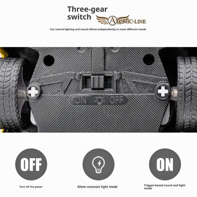 ●ミニカーを机や床に置いて車体フロント上部から押すと、エンジンサウンドと共にヘッドライト・テールランプが点灯します。