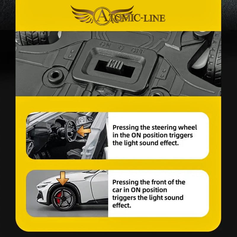 ●ミニカーを机や床に置いて車体フロント上部から押すと、サウンドと共にヘッドライトが点灯します。
