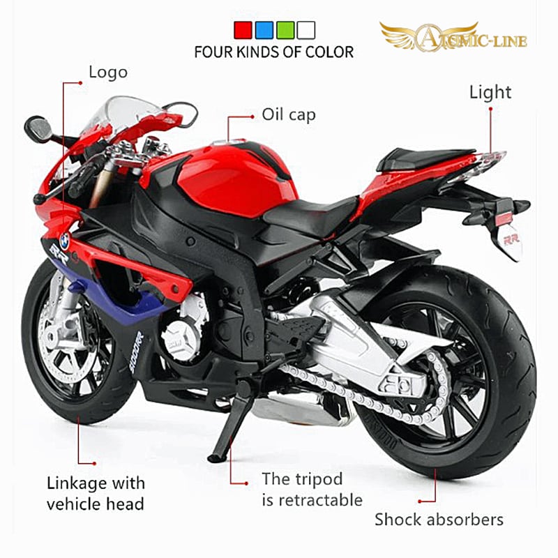 BMW S1000RR 1/12スケールのミニカーは、リアルなディテールと高品質な合金素材で作られたモデルです。全4色のカラーバリエーションが揃っており、ライト点灯やエンジンサウンド再現が可能なので、本物のバイクを見ているかのような臨場感が楽しめます。ジオラマやコレクション用として最適なアイテムです。